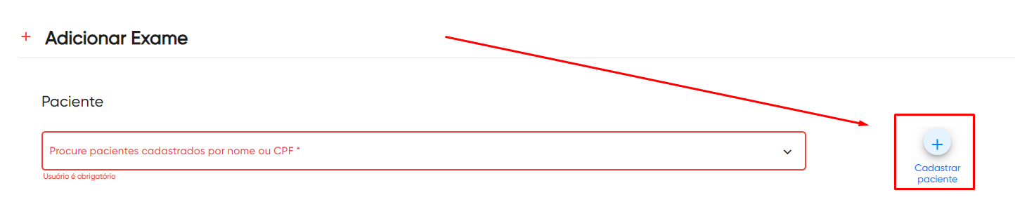 - Procure o paciente pelo nome cadastrado ou CPF, caso não tenha ela cadastrado, é preciso adicionar ele clicando no botão a direita.